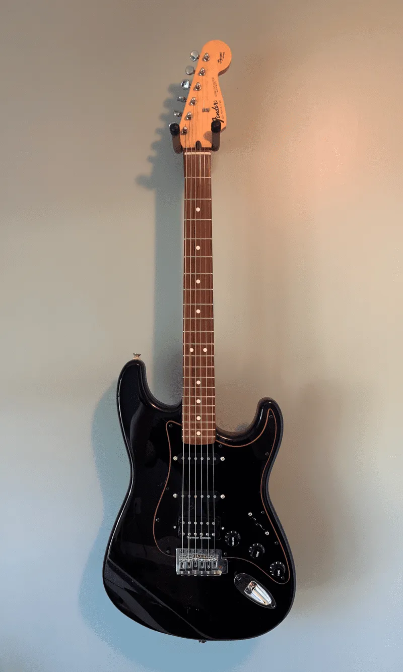 The guitar I ended up getting was a black Fender Stratocaster, Squire series. It’s an interesting product of globalization, there’s a detailed history here, the TL;DR version being: while Squier was known as the cheap version of Fender in the 80s (and it is again, today), the Fender Squire series was American made parts, assembled in Mexico, with Asian electronics.