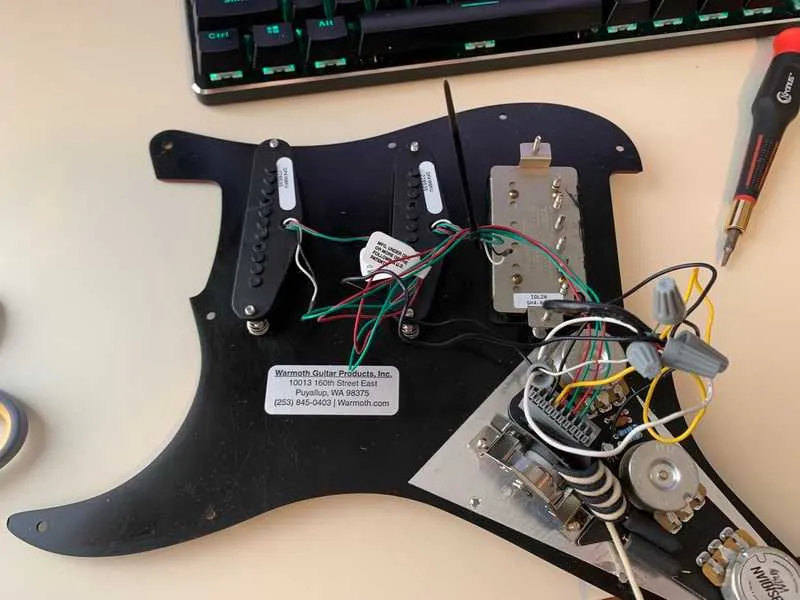 I’ve been trying to either fix or get rid of things in our house, and I decided to do something with it. Fortunately for me and my soldering iron, solderless solutions have become abundant since I last tried this. Mad Hatter Guitar Products sells a few, more oriented towards mix and match solutions or guitars without pick guards. I ended up getting one from Obsidian Wire, who sells all in one solutions wired up with a lot of common wiring mods, e.g. their humbucker, single, single model runs the humbucker through a 500k pot, where most Strats that were single / single / single before had 250k controls. Trust me, this means as much (or little) to you as it means to me.