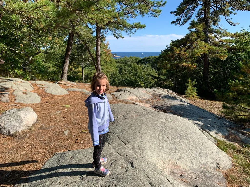 So we drove down the road and pulled in. The parking lot sign read Coolidge Reservation. We found a trailhead and walked in, but picked the one that didn’t have a map, so I looked one up on my phone. Seemed like the trails were short and the other end was a big field by the ocean. Ended up being just the right amount of hiking for a 5 year old, about 2 miles with a little hill that looked out over the ocean, a huge field to run through, and nice rocky Atlantic Ocean cliffs.